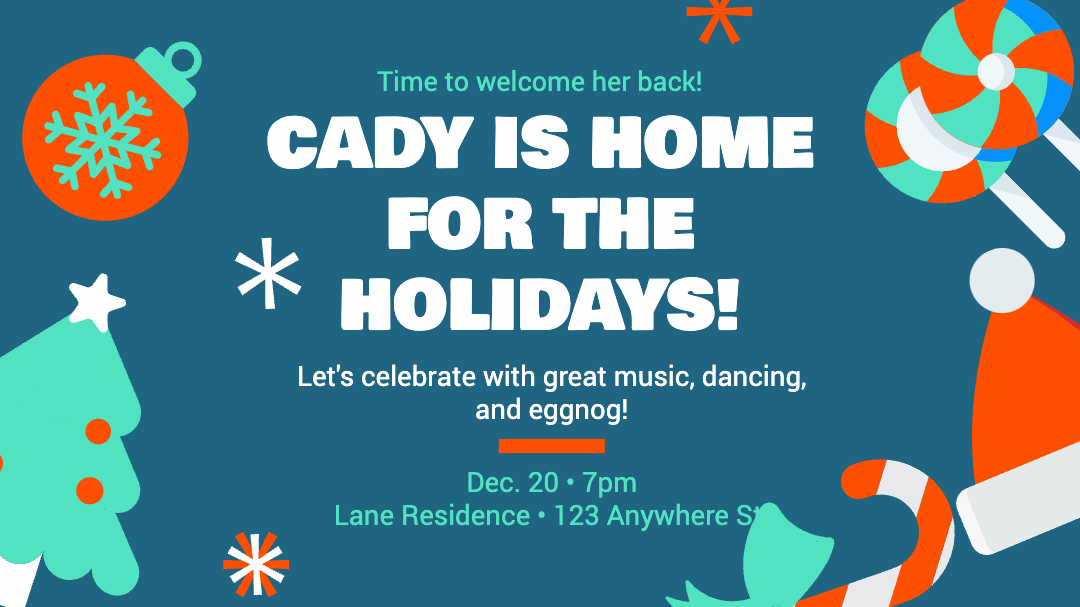 CADY IS HOME FOR THE HOLIDAYS! Time to welcome her back! Let's celebrate with great music, dancing, and eggnog! Dec. 20 • 7pmLane Residence • 123 Anywhere St.